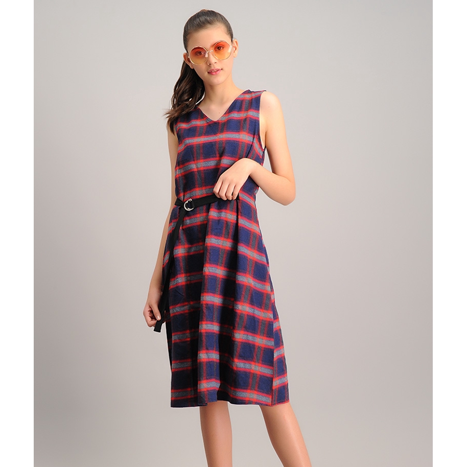 Bench Checkered Printed Dress With Belt Red Navy Blue Shopee